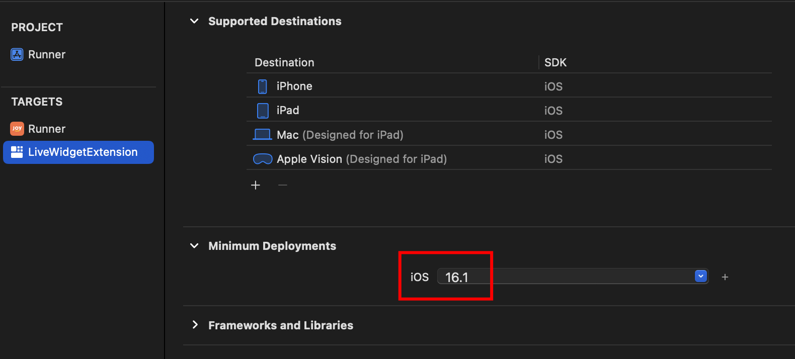 4. 注意 Widget Extension 的 Minimum Deployments 要符合你的裝置,且要大於等於 16.1,否則完全不會有作用也不會有錯誤訊息!他預設是 17.1,這點我卡了最久,因為完全沒有訊息,點擊動態島又會正常回到 APP,所以一直以為是哪裡寫錯導致 UI 沒出來。